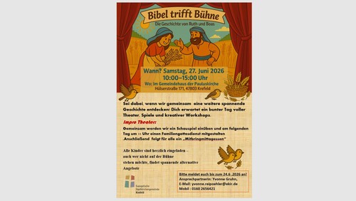Gemeinsam werden wir ein Schauspiel einüben und am folgenden Tag um 11 Uhr einen Familiengottesdienst mitgestalten .Anschließend folgt für alle ein „Mitbringmittagessen“